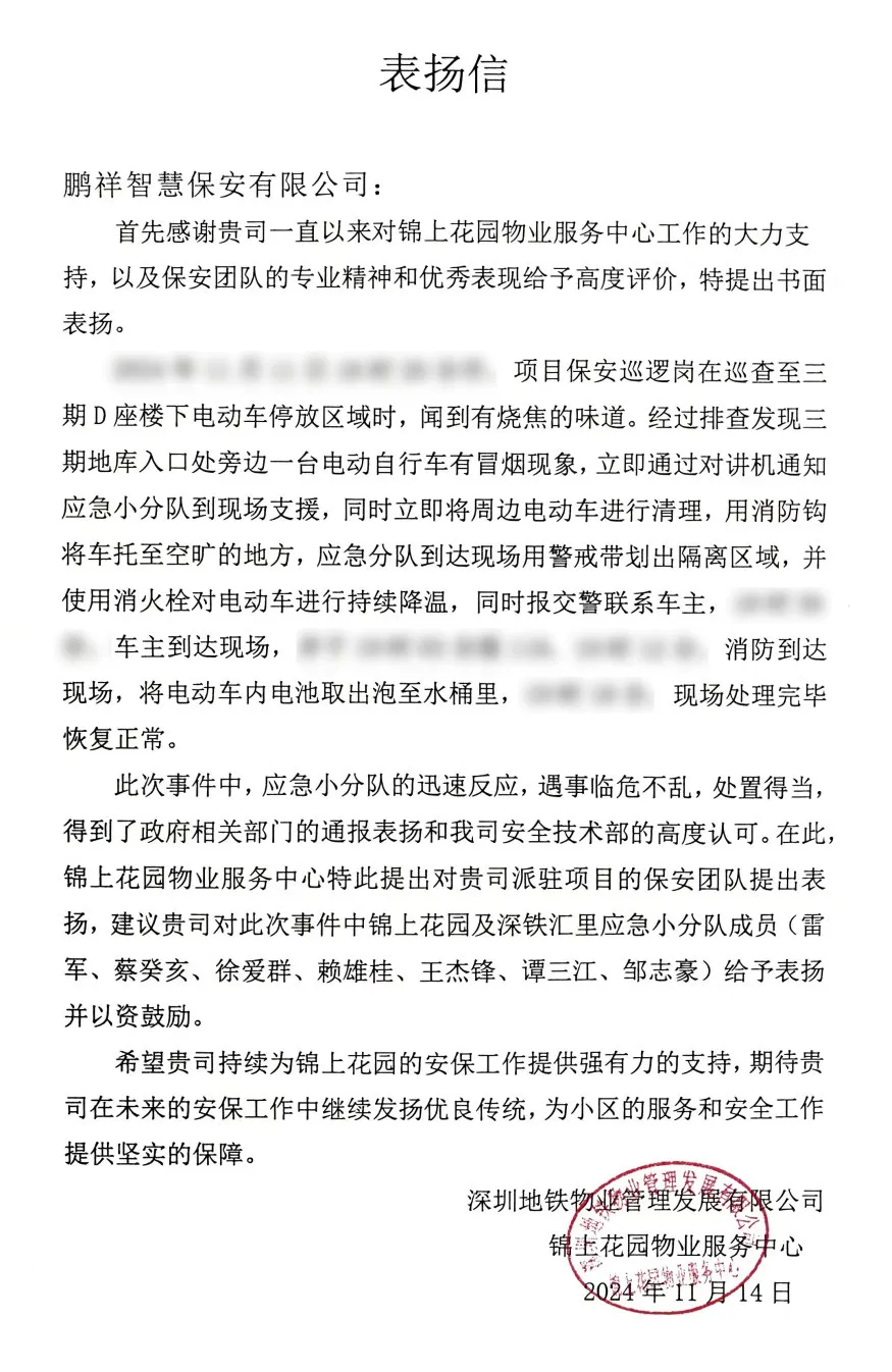 11月11日,鹏祥驻深铁物业项目保安在巡查过程中,发现一辆电动自行车冒黑烟。立即联合应急小分队,清理周边电动车,划出隔离区,随后用消火栓对着火车辆降温,火势迅速消除。此次事件妥善处理,鹏祥受到了六约南社区、深铁物业领导及物业服务中心的高度评价。